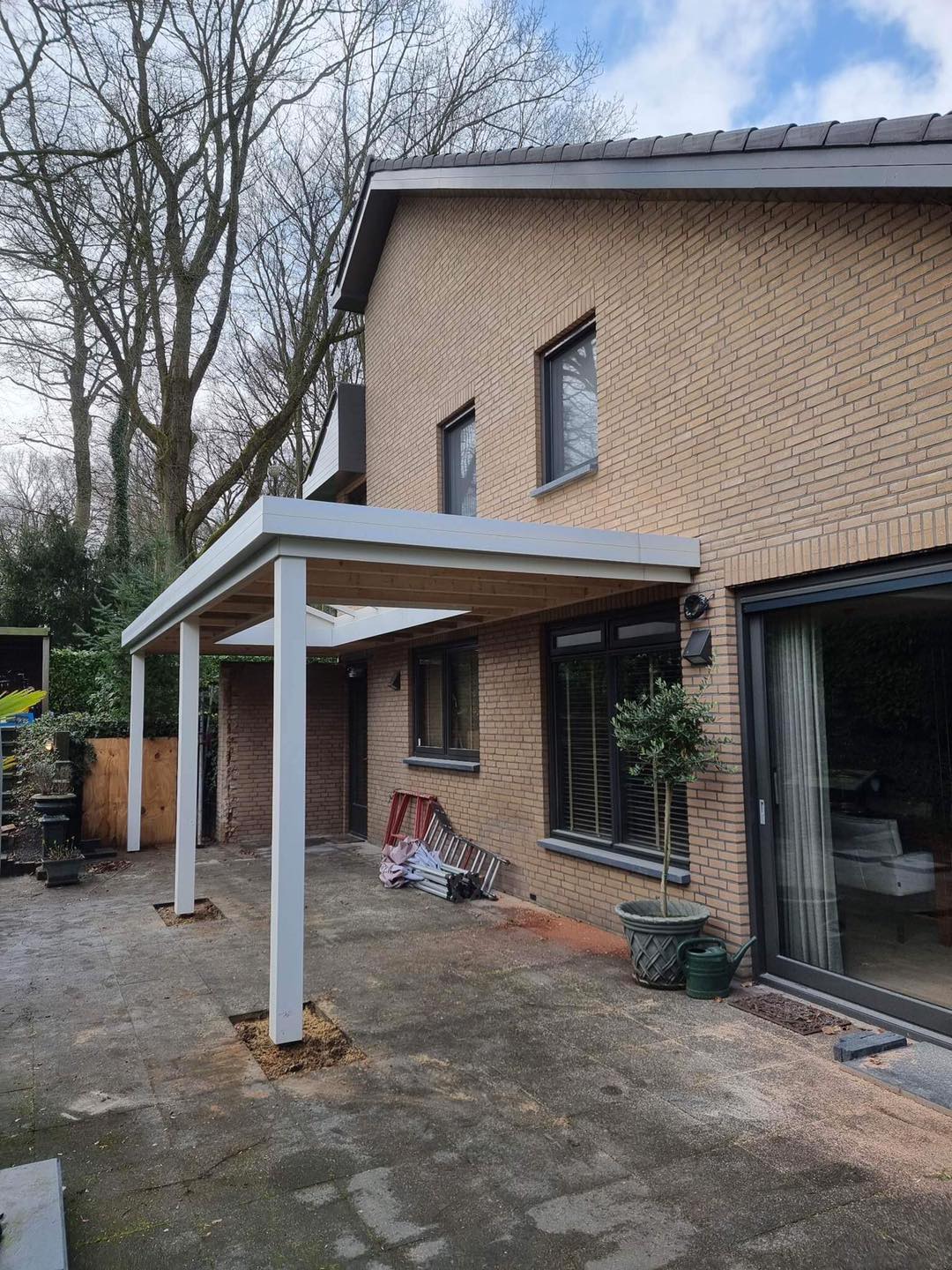 Aan deze moderne woning bouwden we een bijpassende terrasoverkapping. De bewoners schilderen deze zelf in de kleur van de kozijnen. Deze strakke overkapping is voorzien van een luxe zadeldak lichtstraat. Voor behoud van lichtinval in de woning.